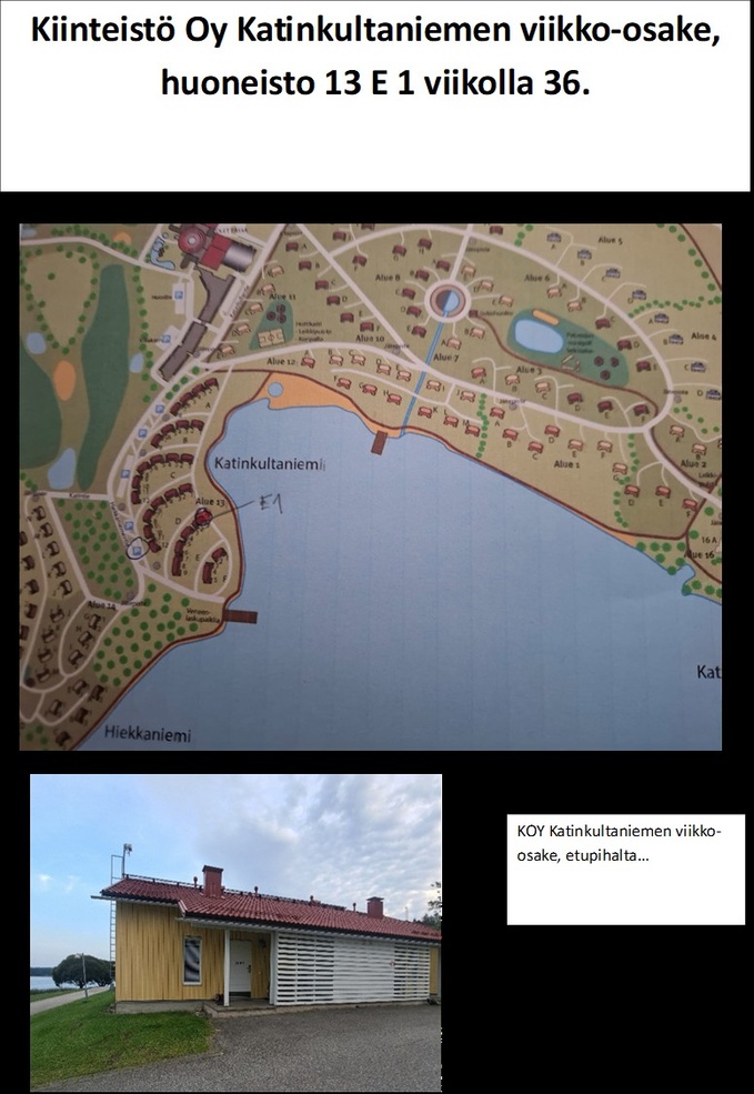 Nyt olisi mahdollisuus vuokrata yhdistyksen omistuksessa olevaa Kiinteistö Oy Katinkultaniemen viikko-osaketta huoneisto 13 E 1 viikolla 36. Osakkeelle ei kuulu harrasteoikeutta, vaan ne on ostettava erikseen.