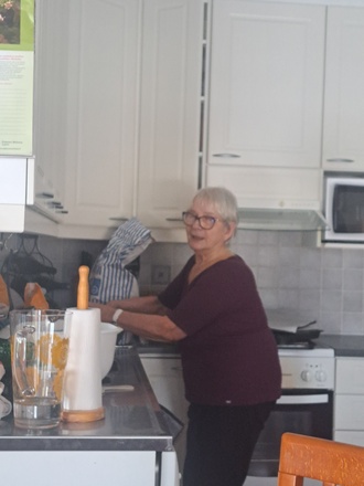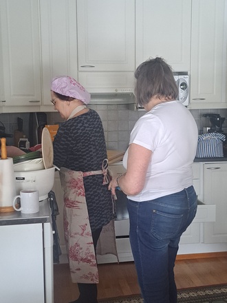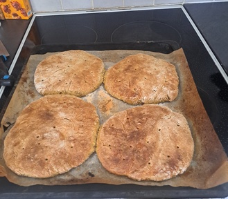 Perjantaina käytiin Mirjamin luona leipomassa Salli Jokelaisen ohjauksessa perinteistä nyrkkirieskaa sekä Mirjamin kuuluisaa kuusenkerkkärieskaa. Kyllä maistui hyvälle puu-uunissa paistettu, uuni tuore rieska.... muutama jäi myyntiin lauantain kirpputorille.